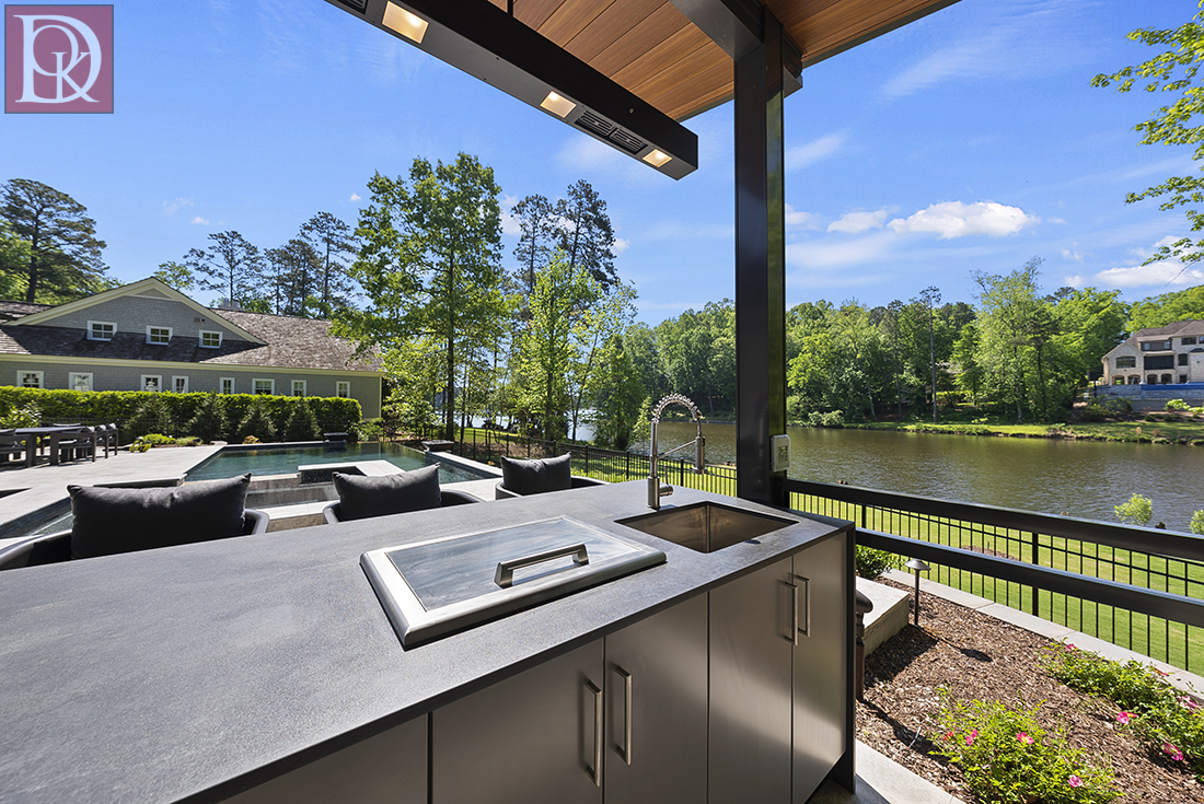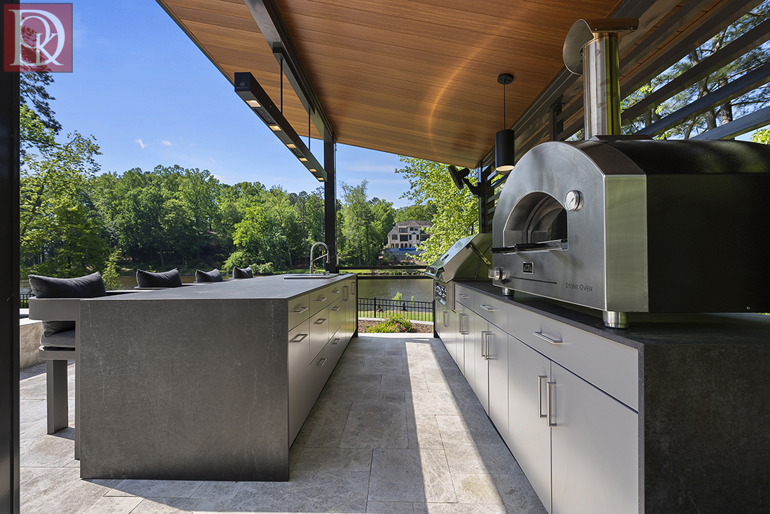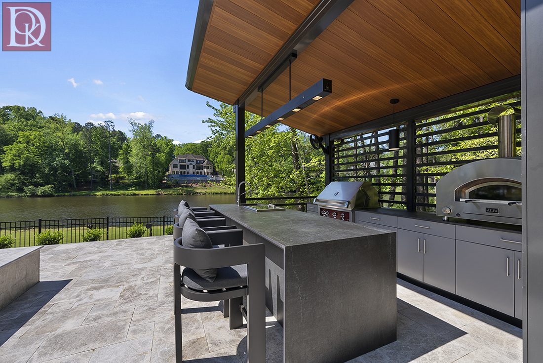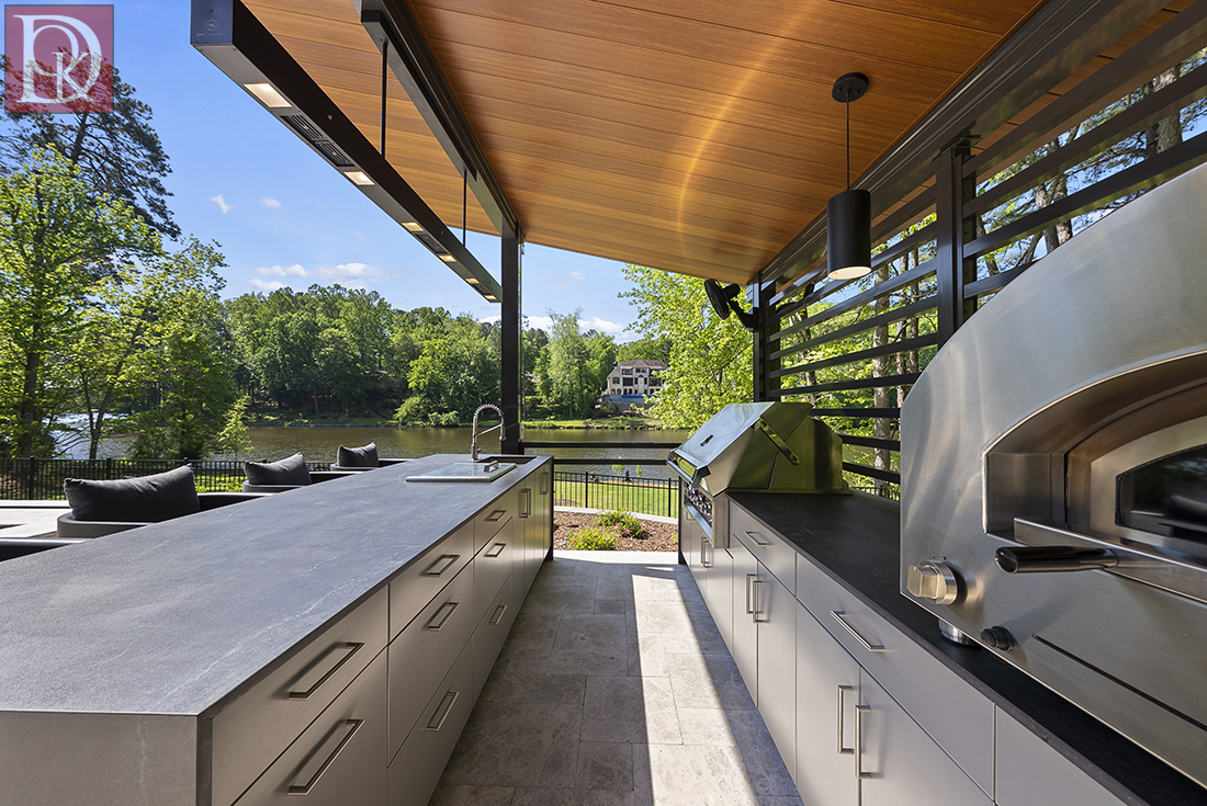 This stunning outdoor kitchen in Cary is designed for both culinary enthusiasts and avid entertainers, perfectly situated poolside and lakefront to maximize enjoyment of the beautiful surroundings. The kitchen features a large pizza oven that is flanked by generous counterspace, a stainless-steel grill, ice bucket, and sink, making the kitchen fully functional. The entire kitchen unit is built on a light-toned paver patio, which extends to create a spacious dining and lounge area. The design is further enhanced by recessed lighting in the overhead structure, ensuring the space is usable and inviting well into the evening, making it a perfect extension of the indoor living area.
