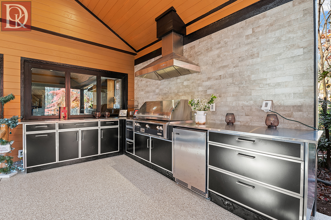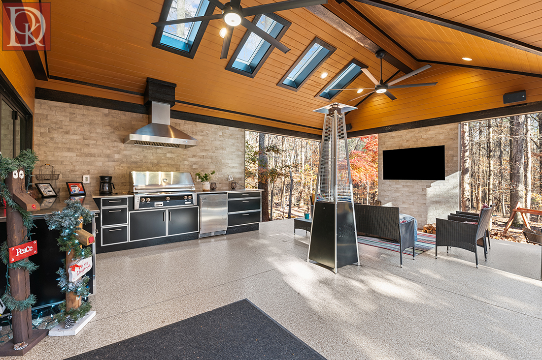 This newly added outdoor kitchen showcases a sleek and modern design, thoughtfully integrated into the existing structure. The space features a warm, honey-toned wood ceiling with several skylights that flood the area with natural light, complemented by dark ceiling beams and fans. The kitchen itself is built against a stylish light-colored stone accent wall, providing a sophisticated backdrop to the dark cabinetry and stainless-steel appliances. It is well equipped with a professional-grade grill and a powerful stainless-steel range hood. A heated seating area is located next to the kitchen, making the space a perfect blend of indoor comfort and outdoor living.